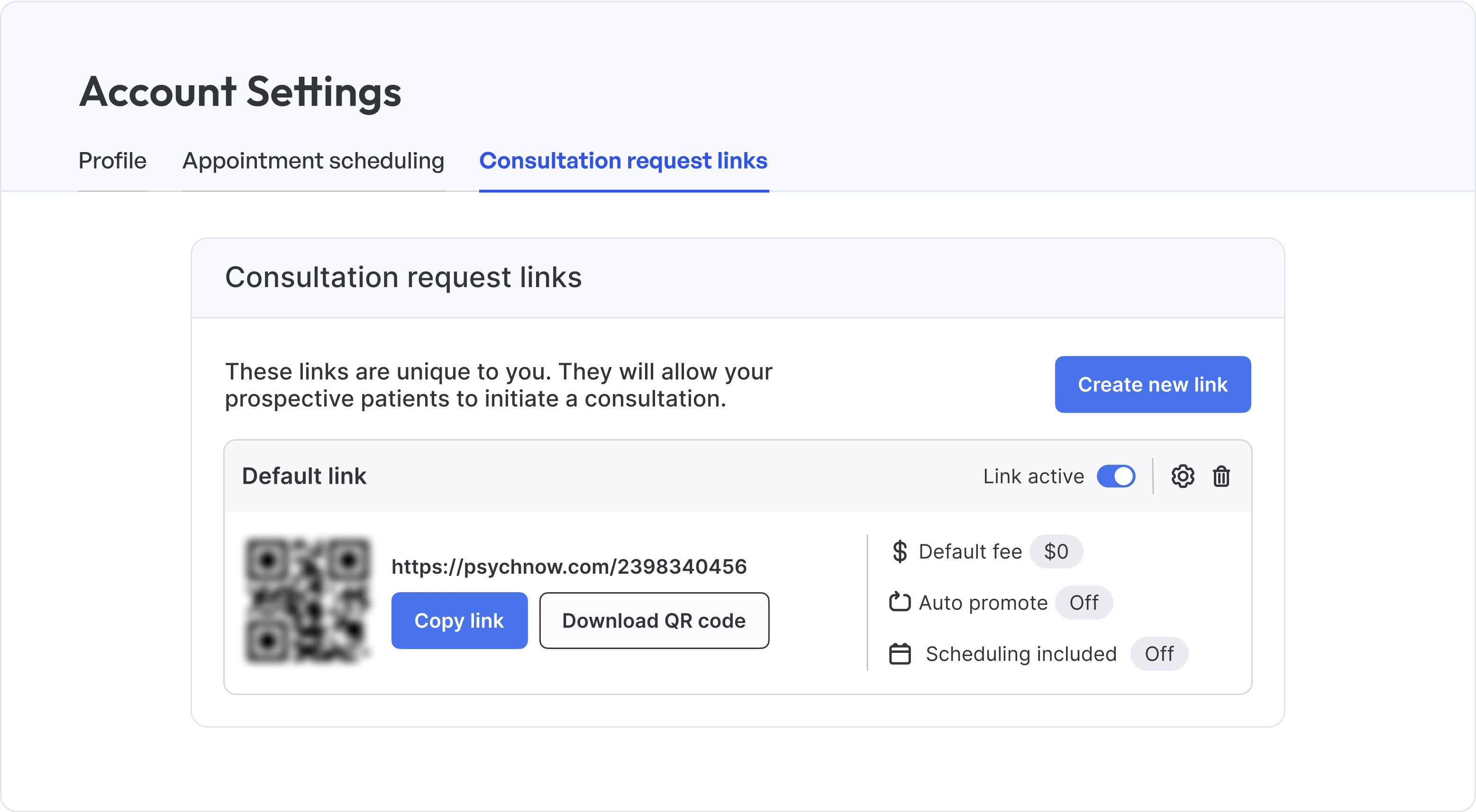 To begin using PsychNow, you must first set up your provider account. This will unlock your personal consultation request links needed for prospective patients to request a consultation.