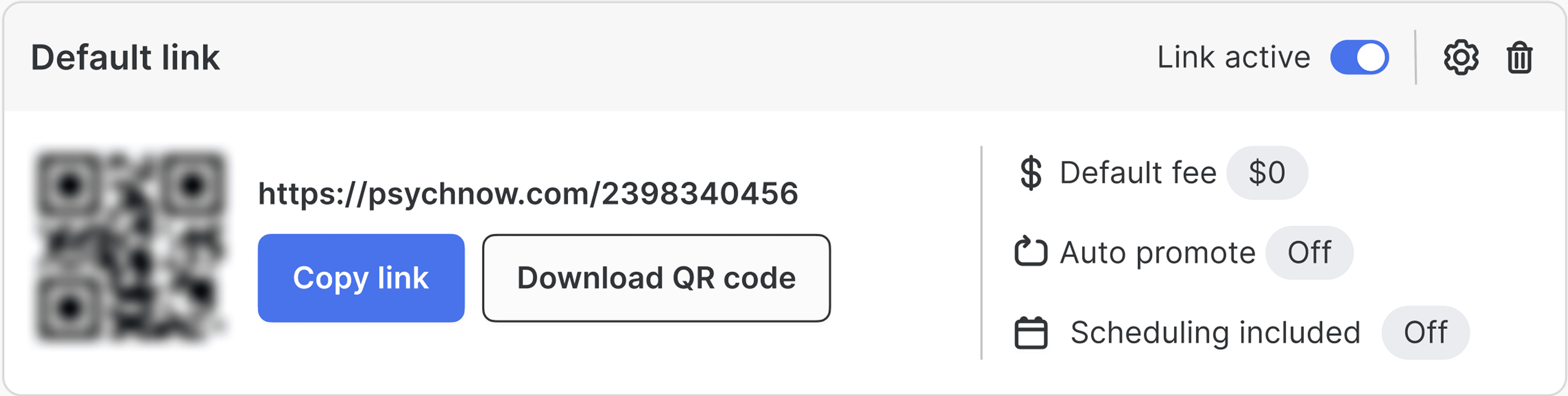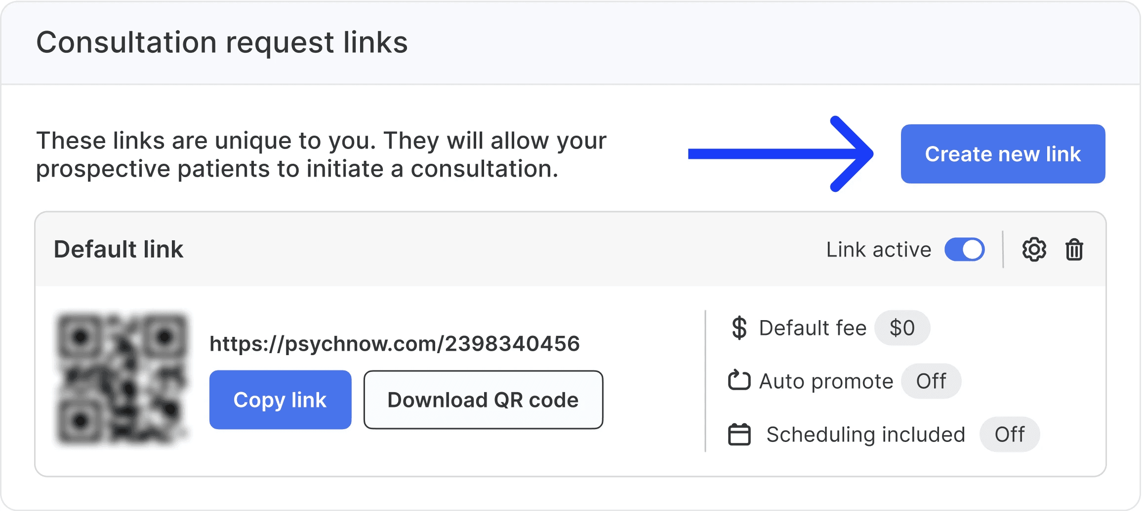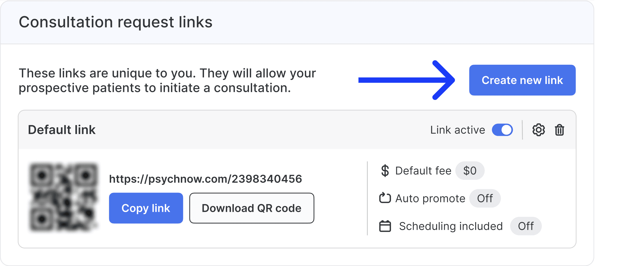 Once configured, each provider account has a single default consultation request link. You can configure the link by pressing the gear icon in the link's title bar.