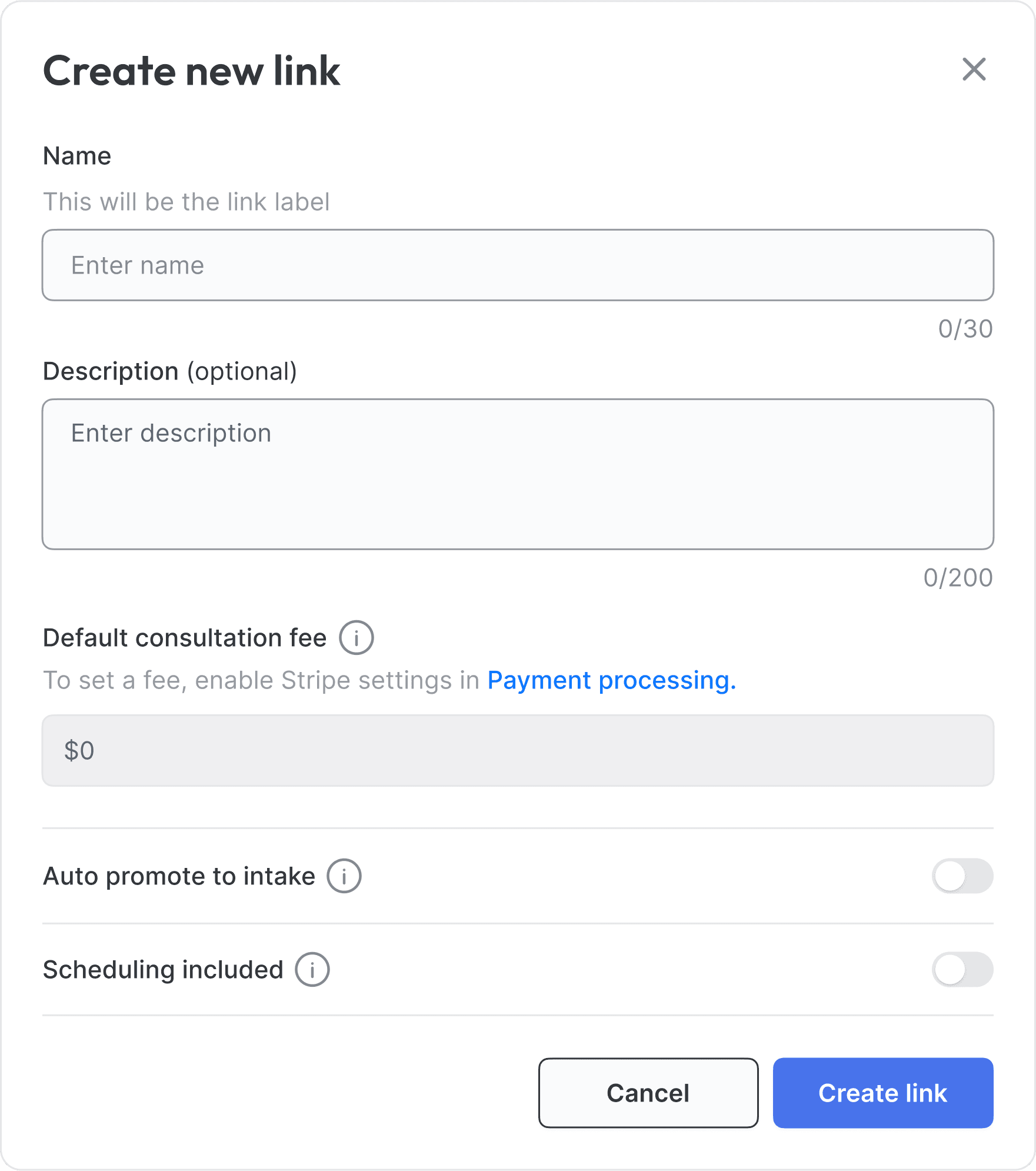The link name and description are visible only to you. The link name is included in the patient consultation so you know which link the patient used to begin their consultation.
